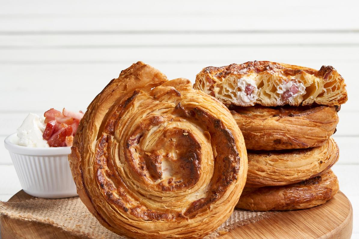 CHEESE & BACON SNECKEN. A premium spiral pastry featuring golden, laminated dough and a gourmet filling of cream cheese and crispy bacon strips.