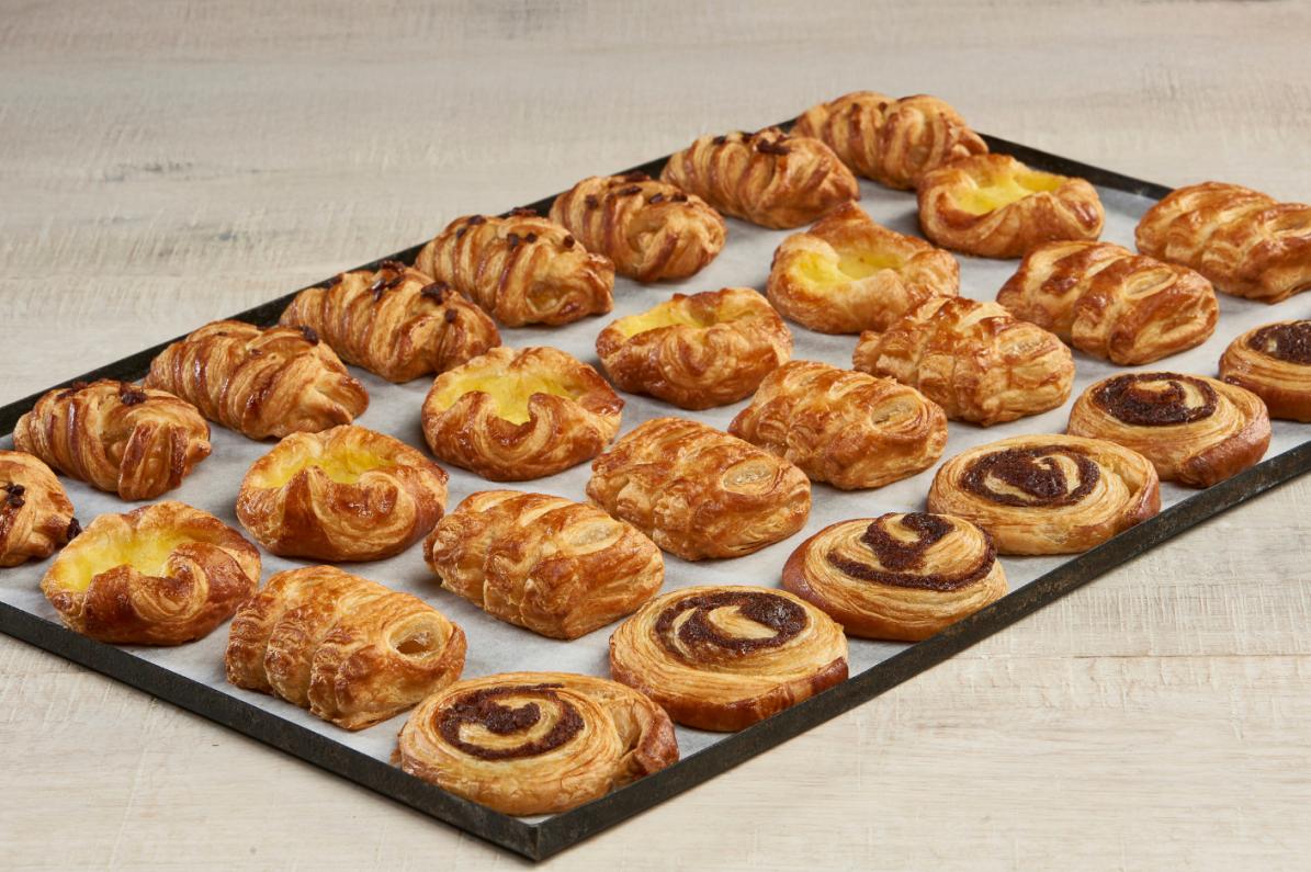 MINI DANISH SELECTION. Four laminated varieties inspired by Northern European pastry traditions, with golden, glossy doughs and premium finishes.