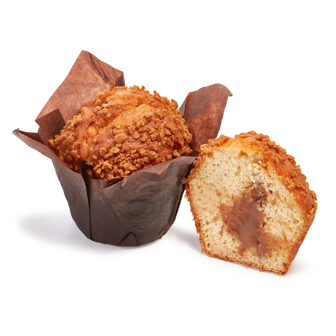 Muffin con cobertura de galleta troceada caramelizada y relleno de crema de galleta caramelizada especiada con canela.
