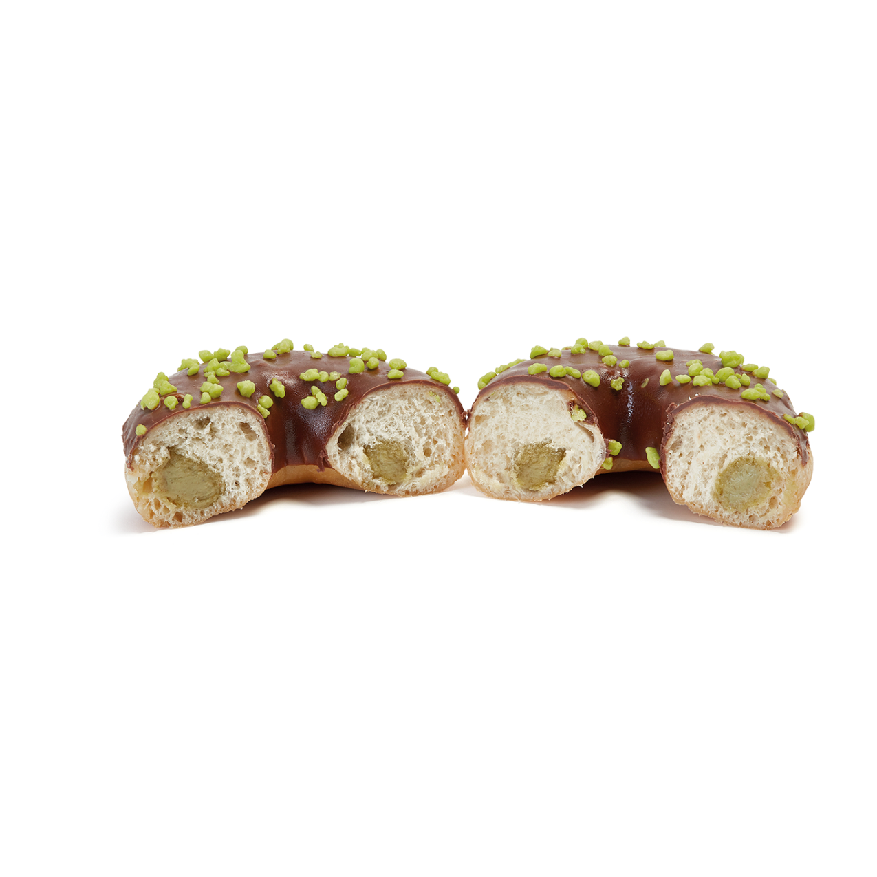 Media cobertura bombón con relleno generoso de crema con pistacho y pasta kadayif en finos hilos, que aporta un toque crujiente e inesperado