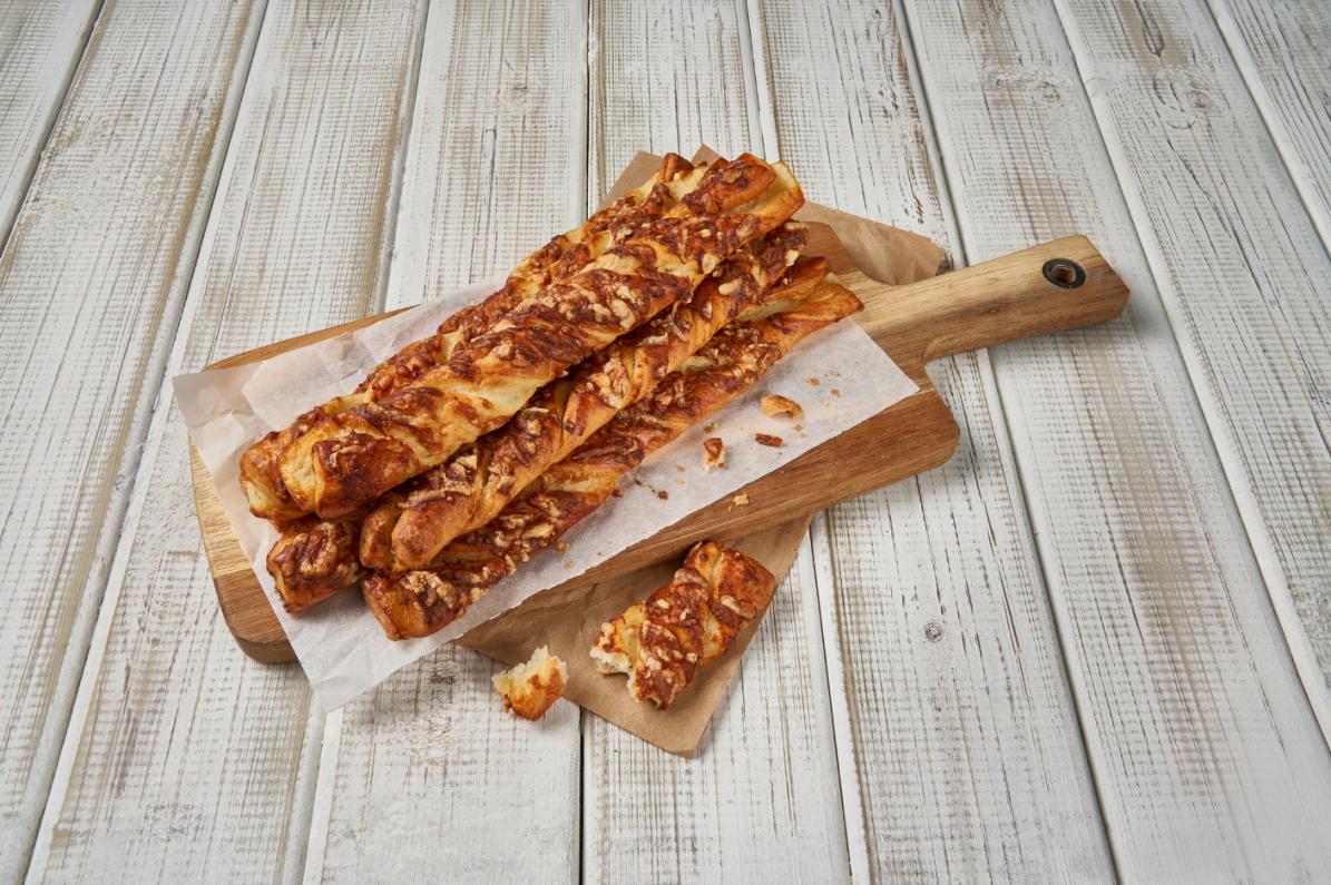 Stick de Queso. Un bocado cremoso y crujiente que combina crema de queso con un exterior hojaldrado y dorado, cubierto con queso emmental gratinado en su superficie.