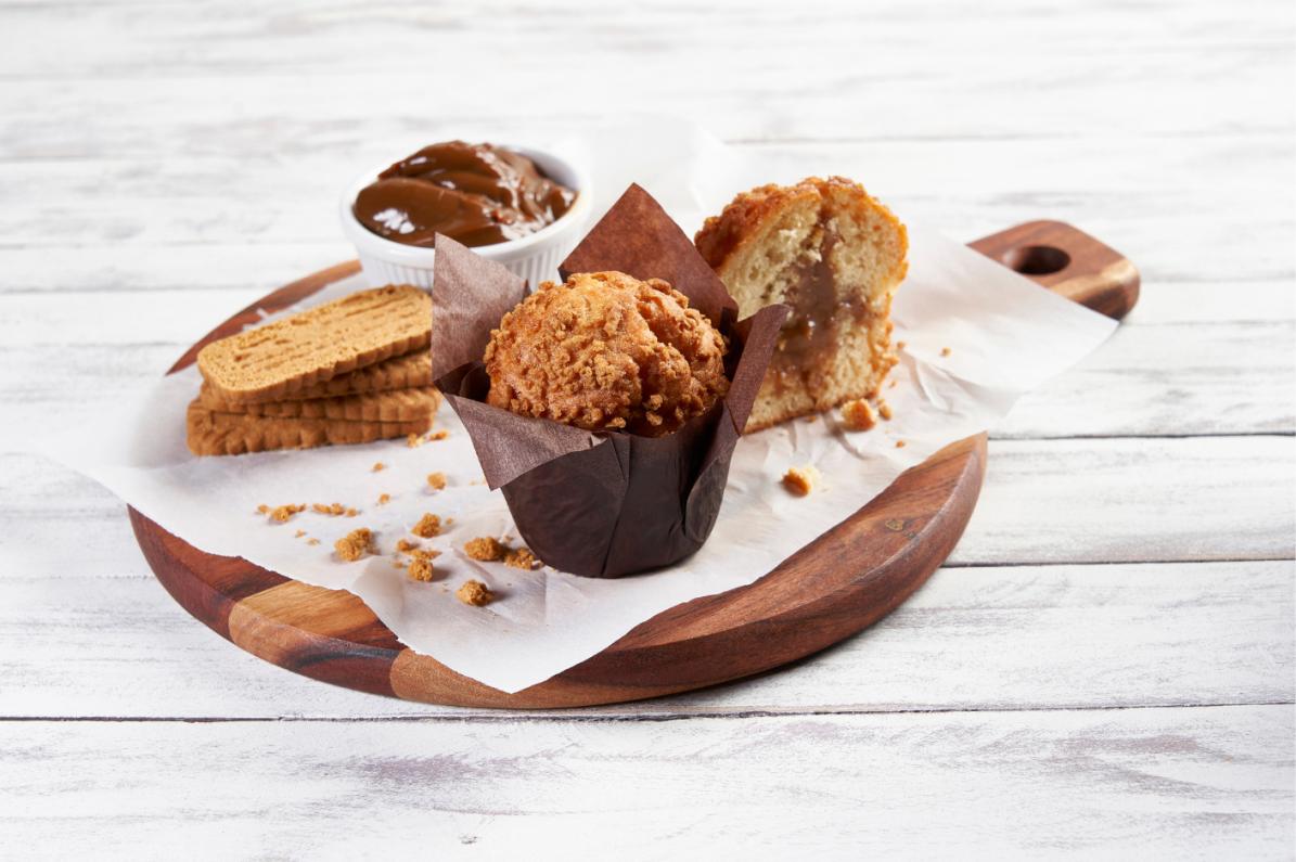 Muffin Caramel Biscuit. Un bizcocho tierno y con relleno cremoso que se inspira en el sabor icónico de las galletas caramelizadas europeas.