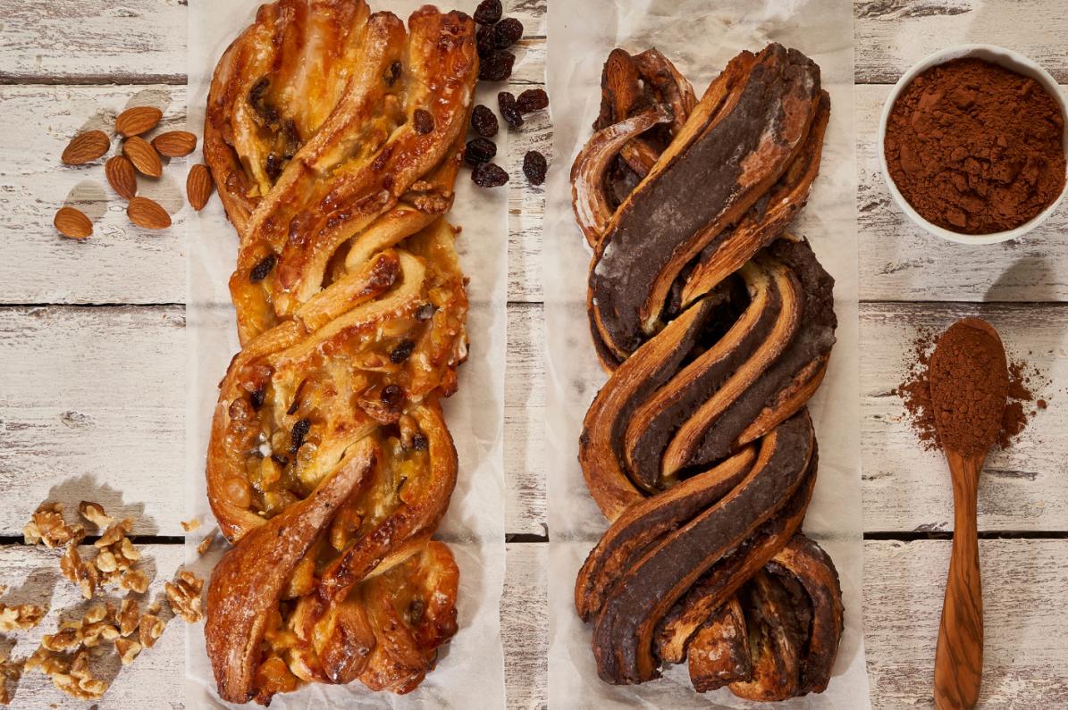 Surtido de Mini Danesas. Cuatro variedades hojaldradas inspiradas en la tradición pastelera del norte de Europa, con masas doradas y brillantes y acabados incomparables.