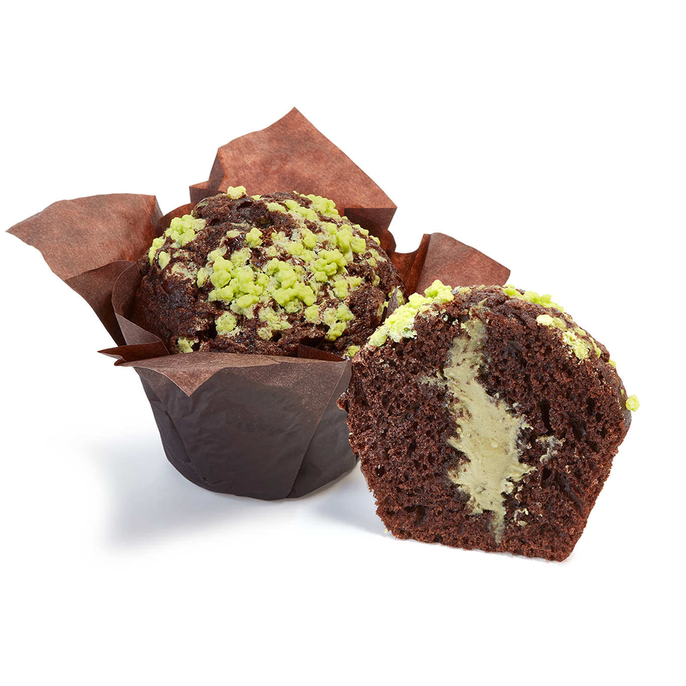 Muffin con masa con cacao, decorado con azúcar perlé de color verde intenso y con un relleno cremoso y crujiente con pistacho y pasta kadayif.